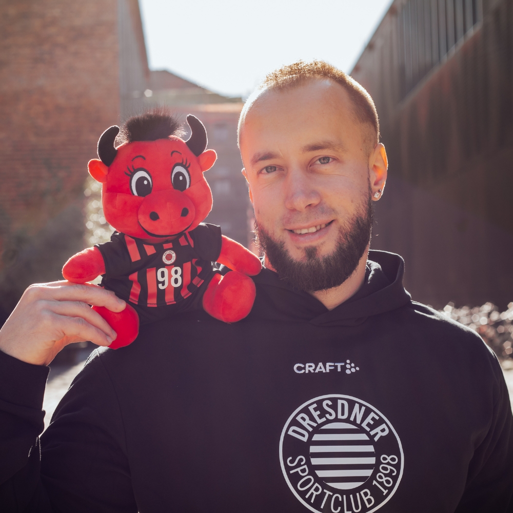 • mit rot-schwarz gestreiften DSCVOLLEY-Trikot und schwarzer Hose